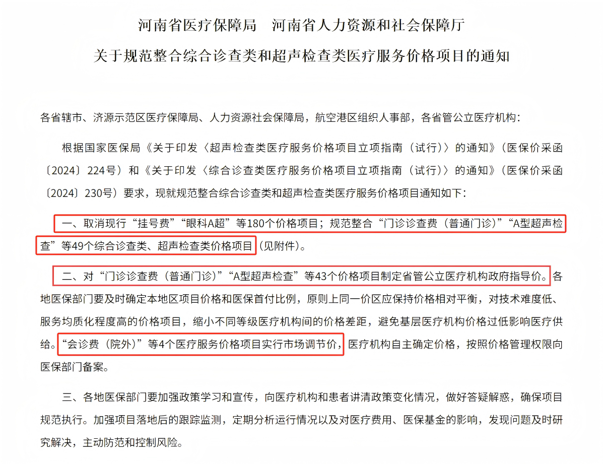 自2025年10月20日起,河南省医疗保障局与河南省人力资源和社会保障厅联合印发的《关于规范整合综合诊查类和超声检查类医疗服务价格项目的通知》(豫医保办〔2025〕51号)正式实施。